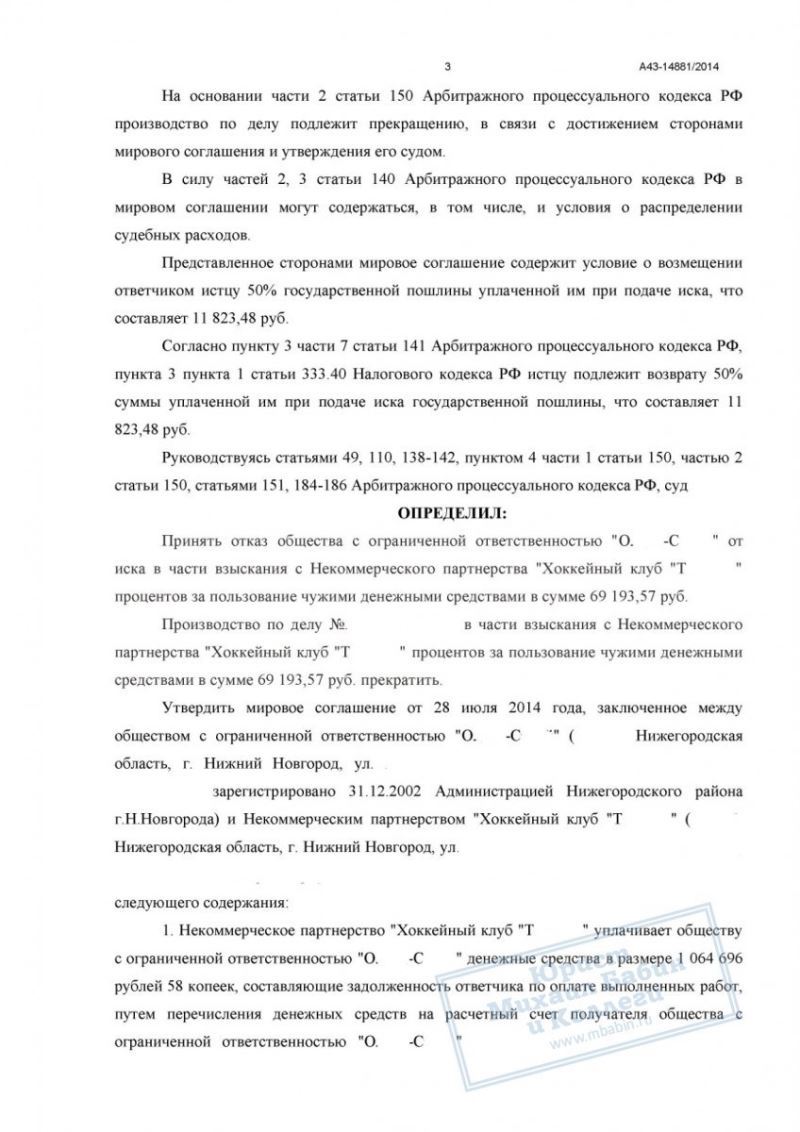 Взыскали 1 000 000 руб. с хоккейного клуба через мировое соглашение
