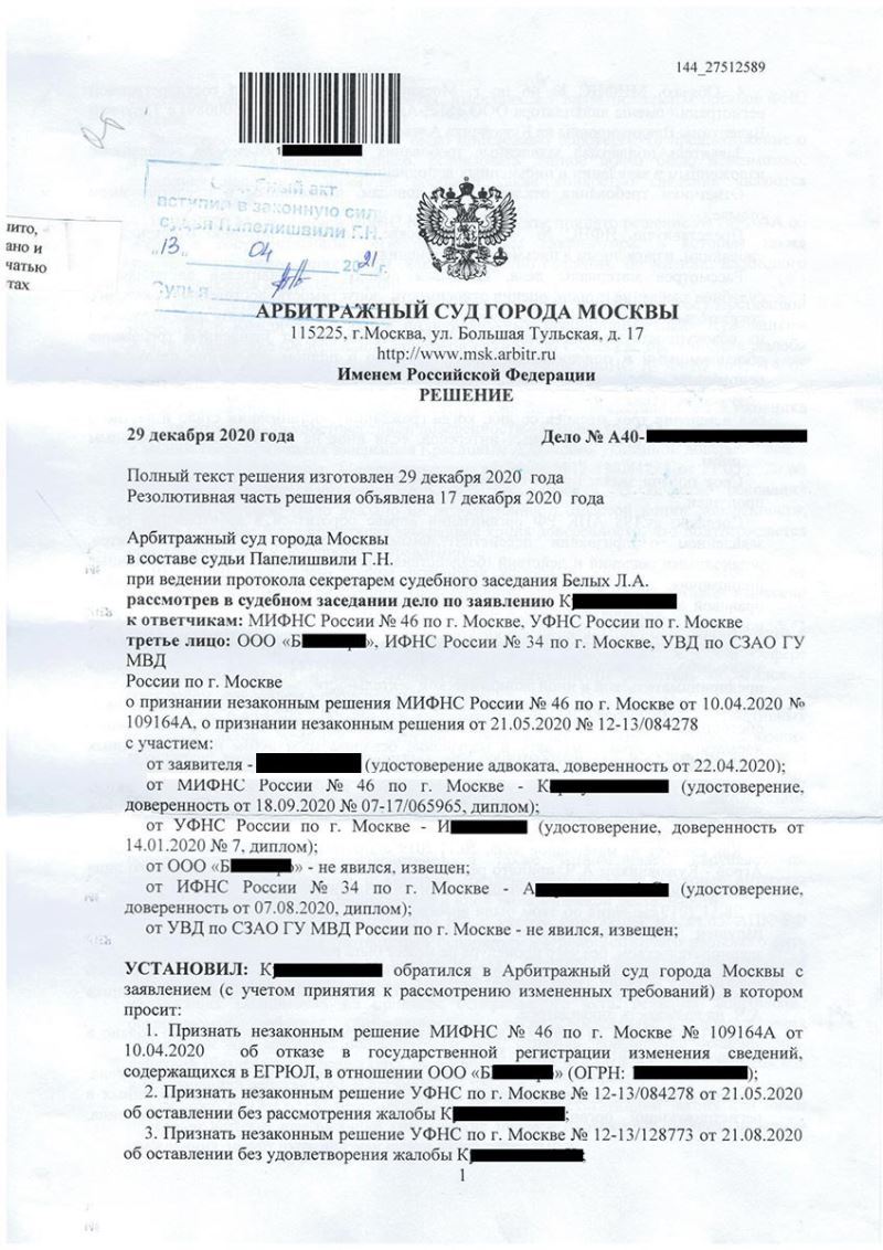 • Решение налоговой признано незаконным и отменено