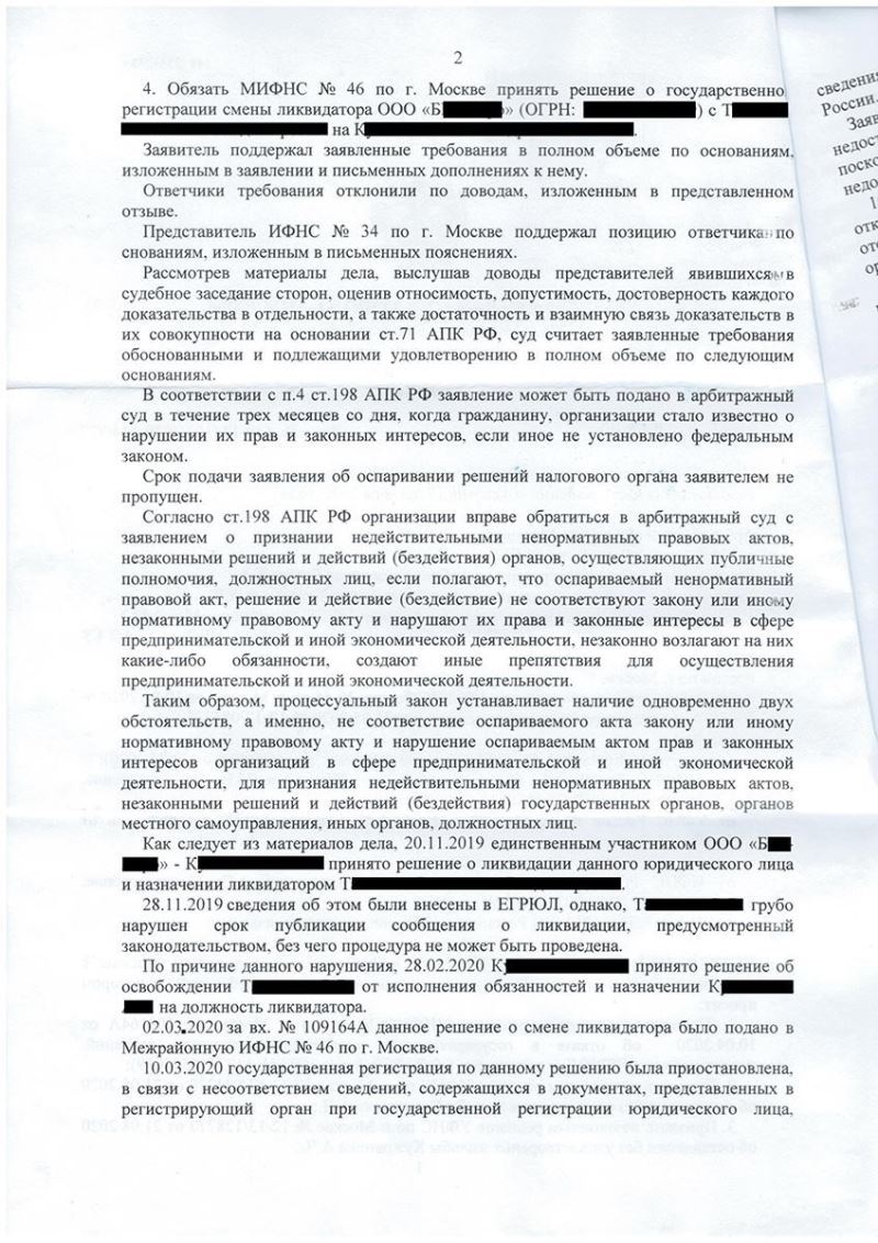 Разработана правовая позиция, согласно которой налоговый орган не имел основания для отказа в смене ликвидатора, подана обязательная досудебная жалоба в вышестоящий налоговый орган, а затем подготовлено и подано заявление в арбитражный суд о признании оспариваемого решения незаконным и обязании налогового органа сменить ликвидатора, также принято участие во всех судебных заседаниях.