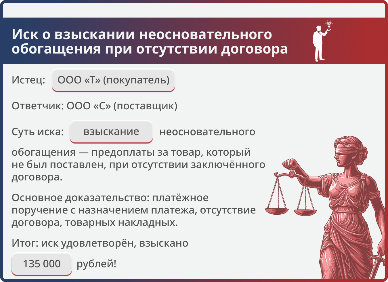 - Неосновательное обогащение. Поскольку договор не заключён, а товар не поставлен, у ответчика отсутствуют правовые основания для удержания полученных денежных средств. В силу ст. 1102 ГК РФ сумма является неосновательным обогащением и подлежит возврату.