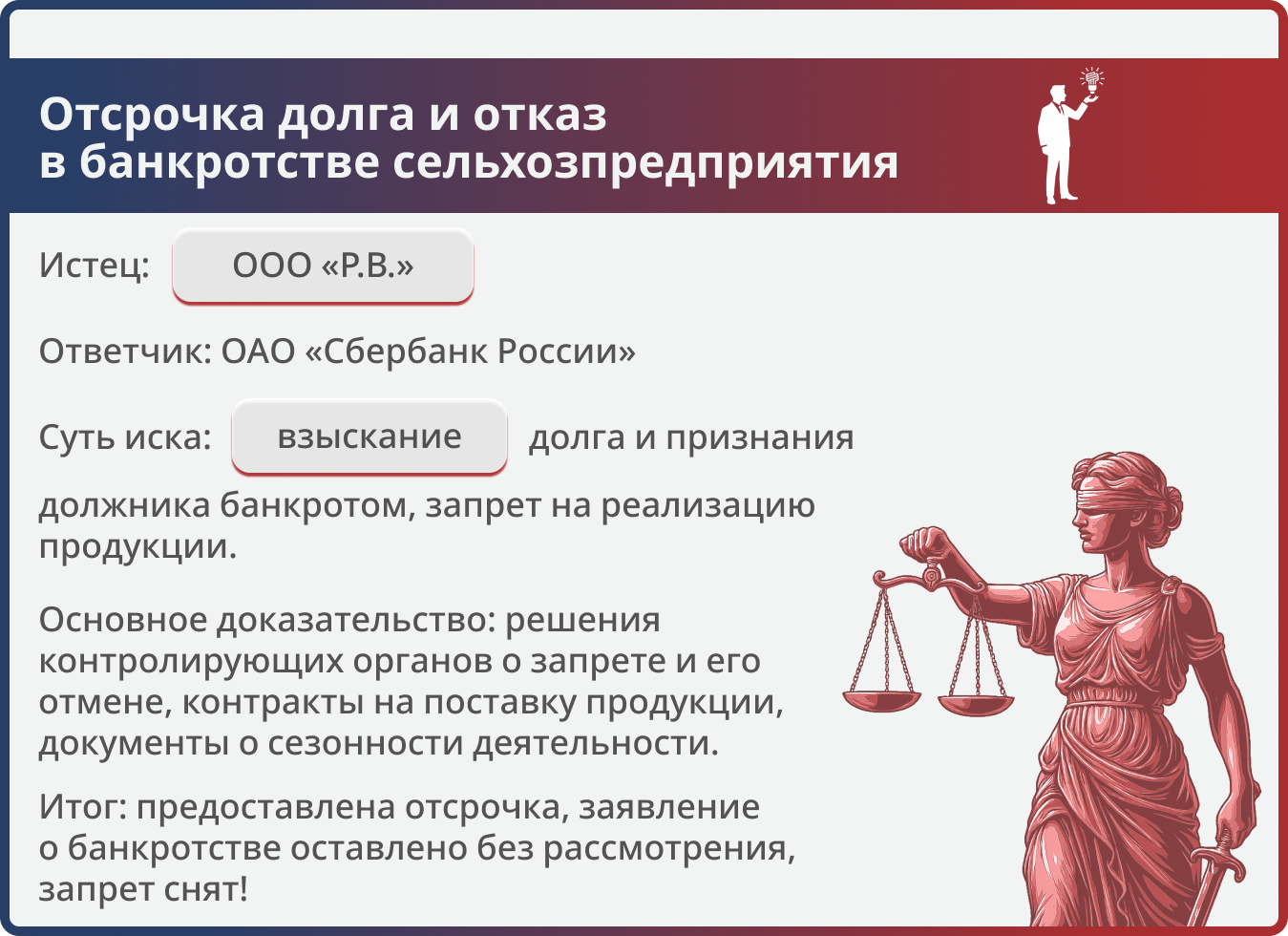 Из‑за запрета госветнадзора сельхозпредприятие не могло продавать продукцию и накопило долги. Сбербанк требовал немедленного взыскания и банкротства. Юристы коллегии добились отсрочки исполнения, оставили заявление о банкротстве без рассмотрения и помогли снять административные ограничения. Предприятие сохранило бизнес.