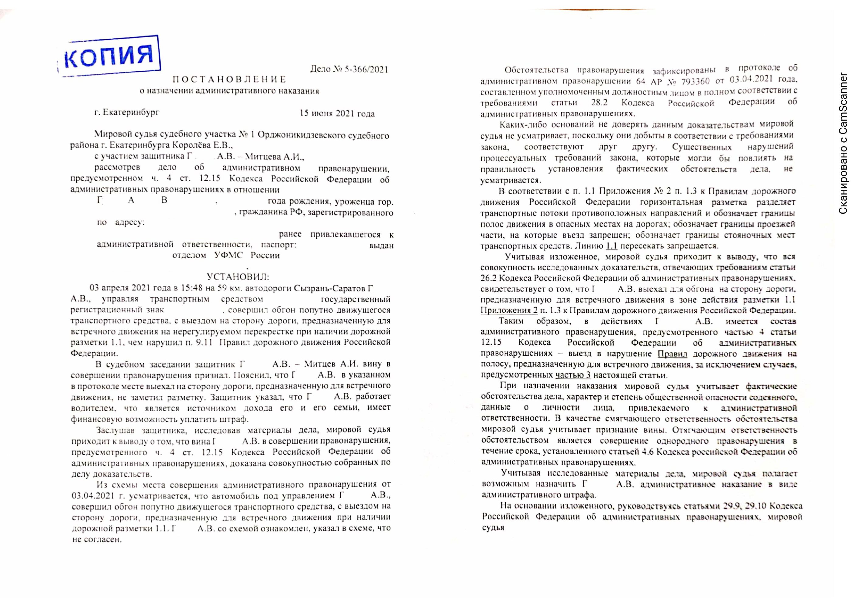 Рассмотрев дело об административном правонарушении, предусмотренном ч.4 ст.12.15 Кодекса РФ об административных нарушениях был назначен штраф 5000 рублей. Права сохранены.