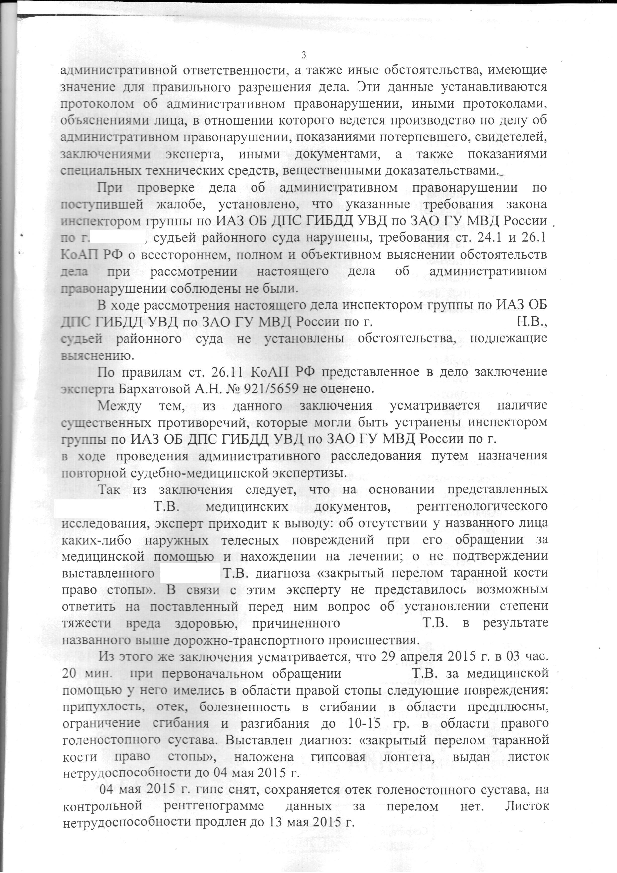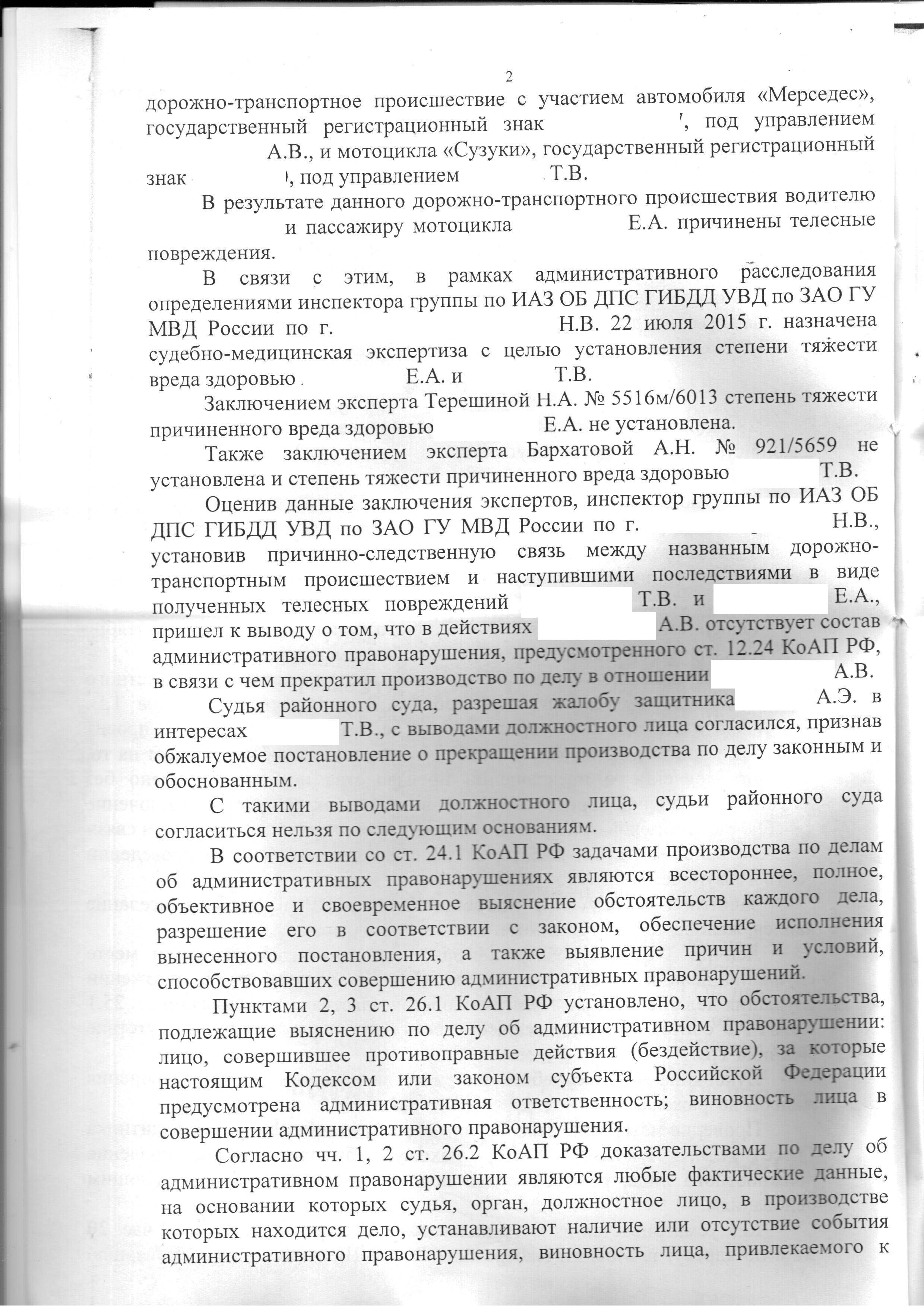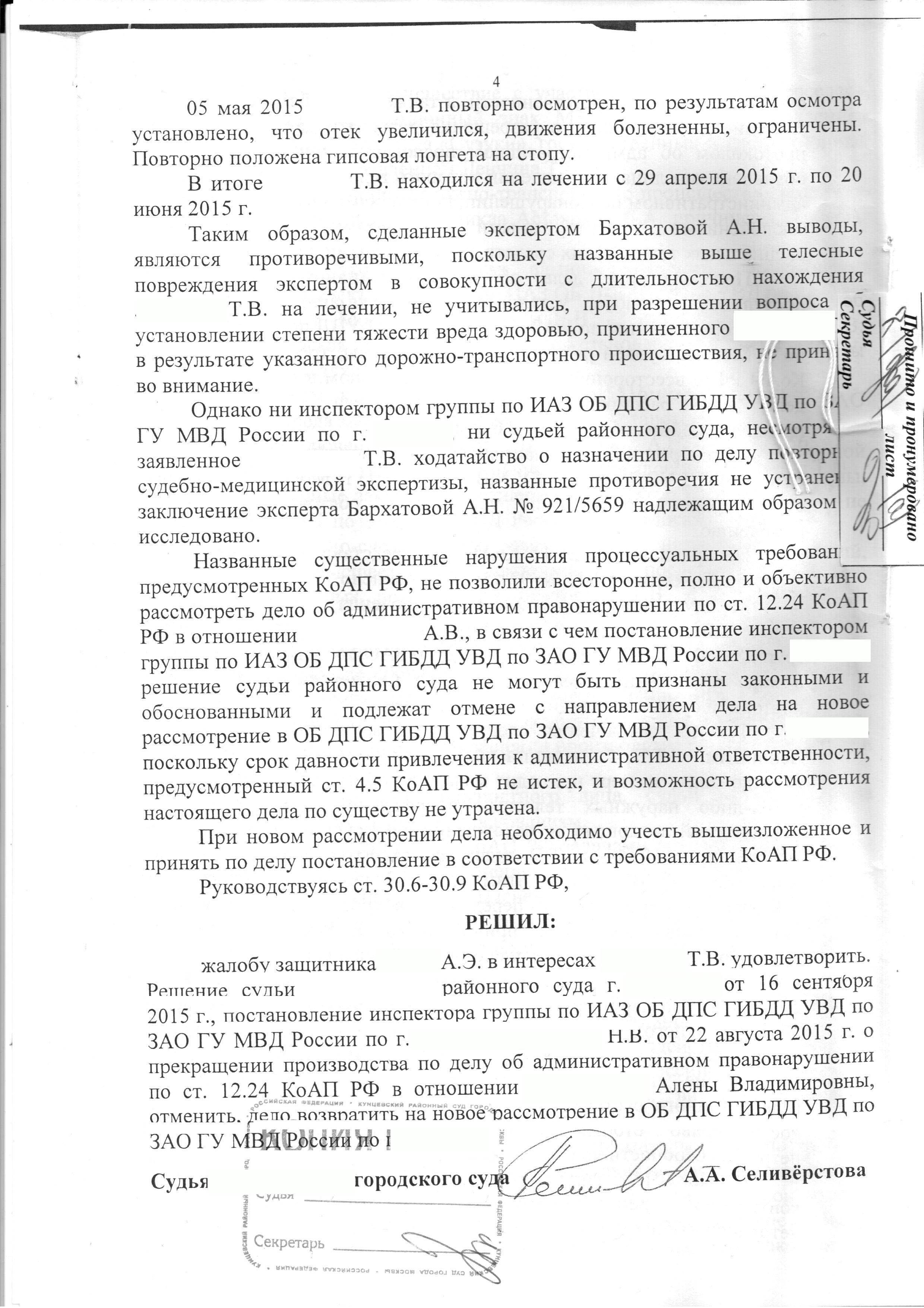 Согласно поданным материалам дела, 28 апреля 2015 года произошло ДТП при участии автомобиля «Мерседес» и мотоцикла «Сузуки», в результате которого водителю и пассажиру мотоцикла были причинены телесные повреждения. Судья, изучив материалы дела, доводы поданной жалобы, приняла решение об отмене вердикта суда и постановления инспектора группы по ИАЗ ОБ ДПС ГИБДД УВД. Таким образом, поданная жалоба была удовлетворена в полной мере. В то же время, согласно данному решению, дело об административном правонарушении возвращено на новое рассмотрение с учетом выявленных обстоятельств.