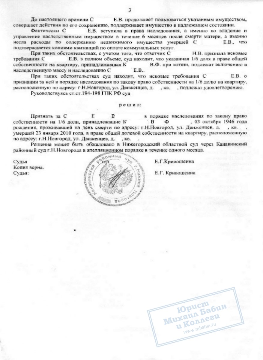 Сестра Е.С. и прочие совладельцы недвижимости не имели к ней претензий. В результате суд признал право собственности нашей клиентки на наследство даже без её присутствия на суде.