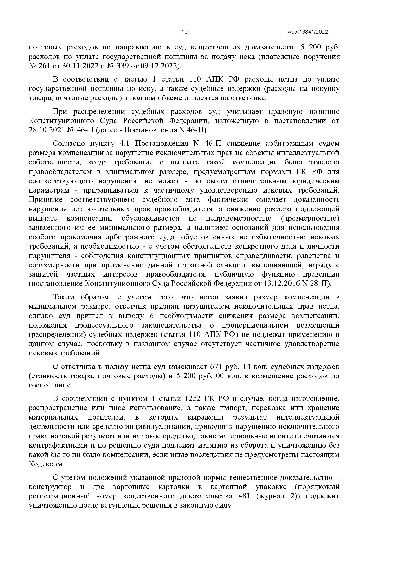 Истец требовал 140 000 руб. компенсации за продажу конструктора с изображениями персонажей «Фиксики» (14 объектов интеллектуальных прав). Наши юристы компании доказали возможность снижения на основании п. 3 ст. 1252 ГК РФ, и суд уменьшил выплату вдвое — до 70 000 руб.