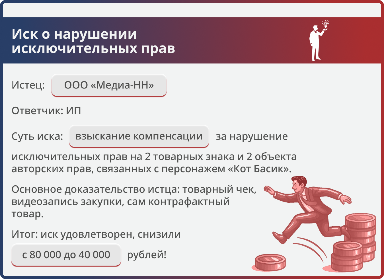 Истец требовал 80 000 руб. за нарушение прав на товарные знаки и авторские права, связанные с популярным персонажем «Кот Басик». Юристы компании убедили суд в несоразмерности суммы, и компенсация снижена вдвое.