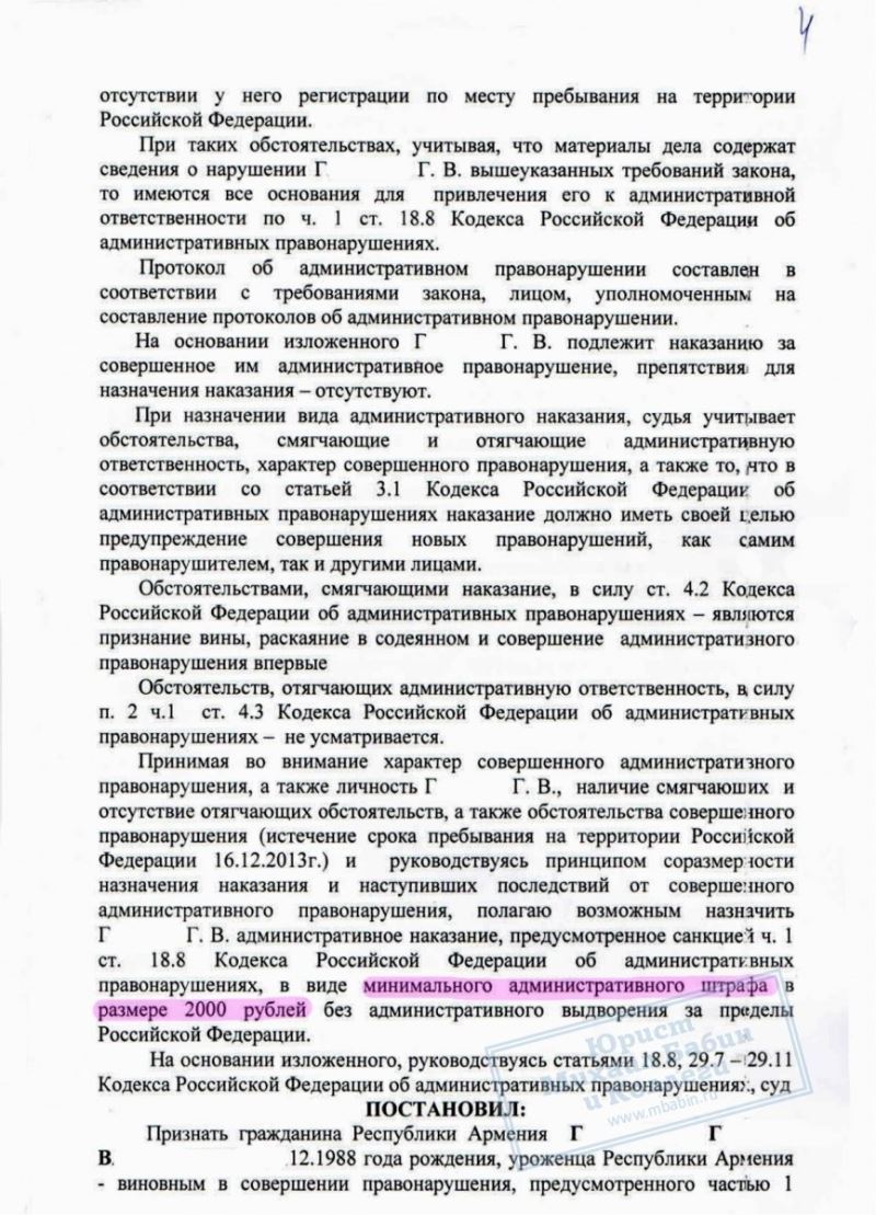Однако наш юрист, защищающий интересы Г., убедительно представил на суде ряд смягчающих обстоятельств: признание вины, совершение правонарушения впервые, а также своевременную оплату гражданином патента. В результате судья назначила Г. минимально возможное наказание в виде 2000 руб. штрафа без административного выдворения.