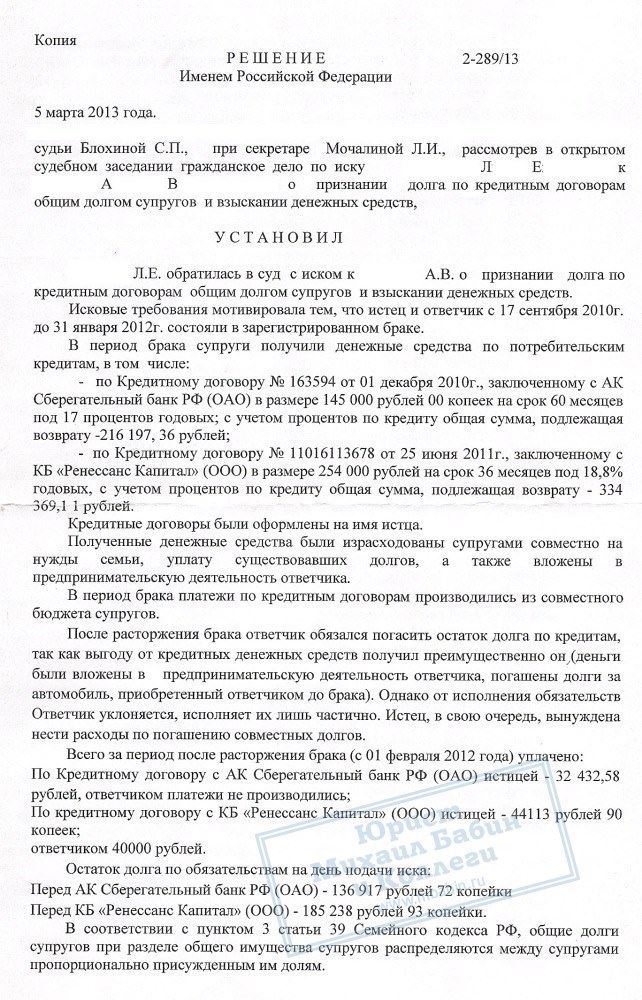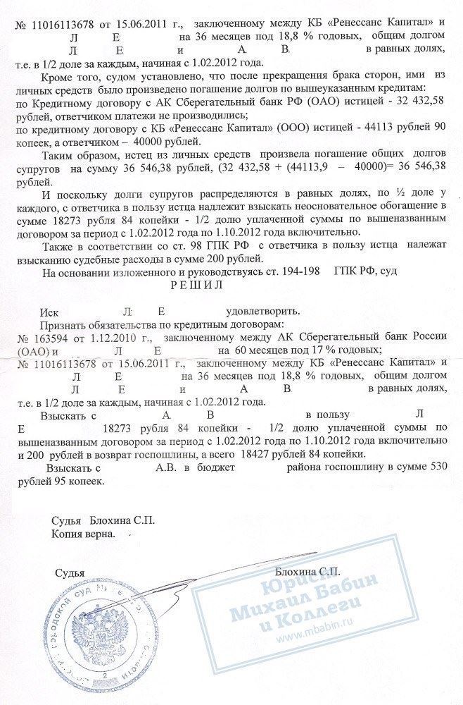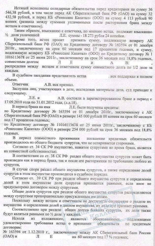 Решением суда было кредиты признаны общими и разделены между бывшими супругами пополам. Половина суммы долга уже уплаченная истицей, взыскана с ответчика.