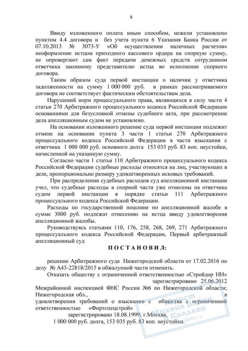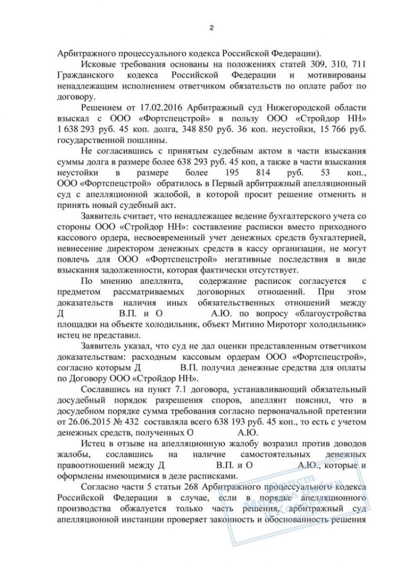 С помощью юриста нашей фирмы ООО "Ф" подала апелляционную жалобу, так как "С" умолчали о выплаченном ранее 1 млн. рублей, на который была оформлена расписка. На новом судебном заседании долг наших клиентов был пересмотрен и уменьшен на 1000 000 рублей долга и 153 000 рублей неустойки.