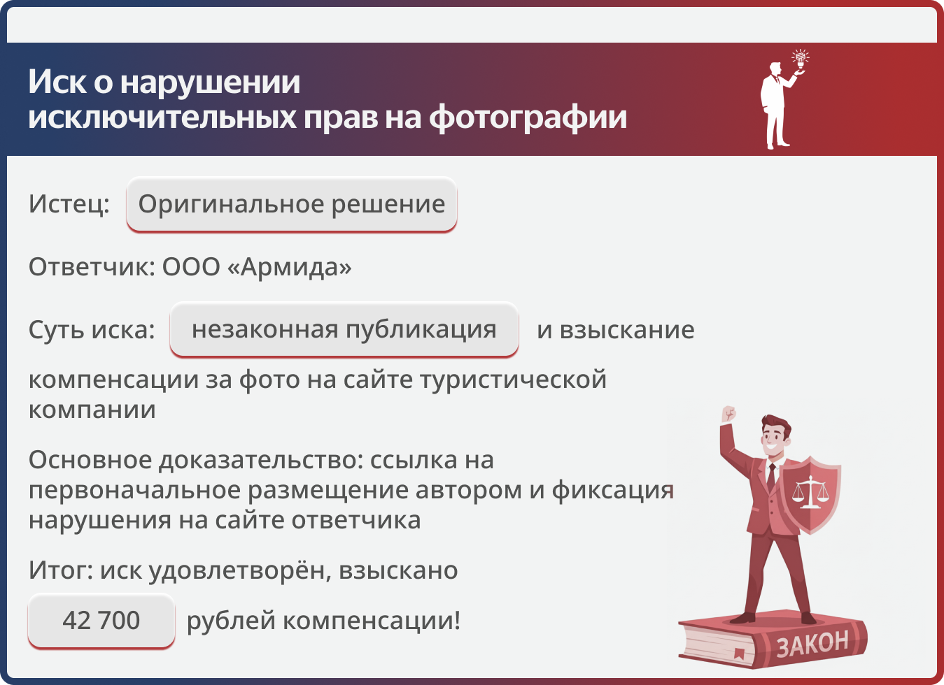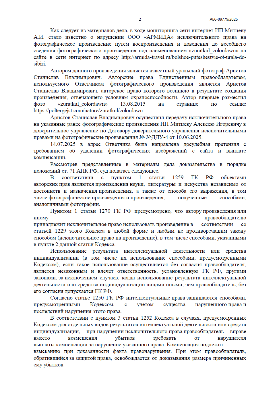 Разбирательство проходило в Арбитражном суде города Санкт-Петербурга и Ленинградской области в порядке упрощенного производства. Мы доказали факт нарушения авторских прав на фотографическое произведение и добились полной выплаты компенсации, несмотря на попытки ответчика оспорить сумму.