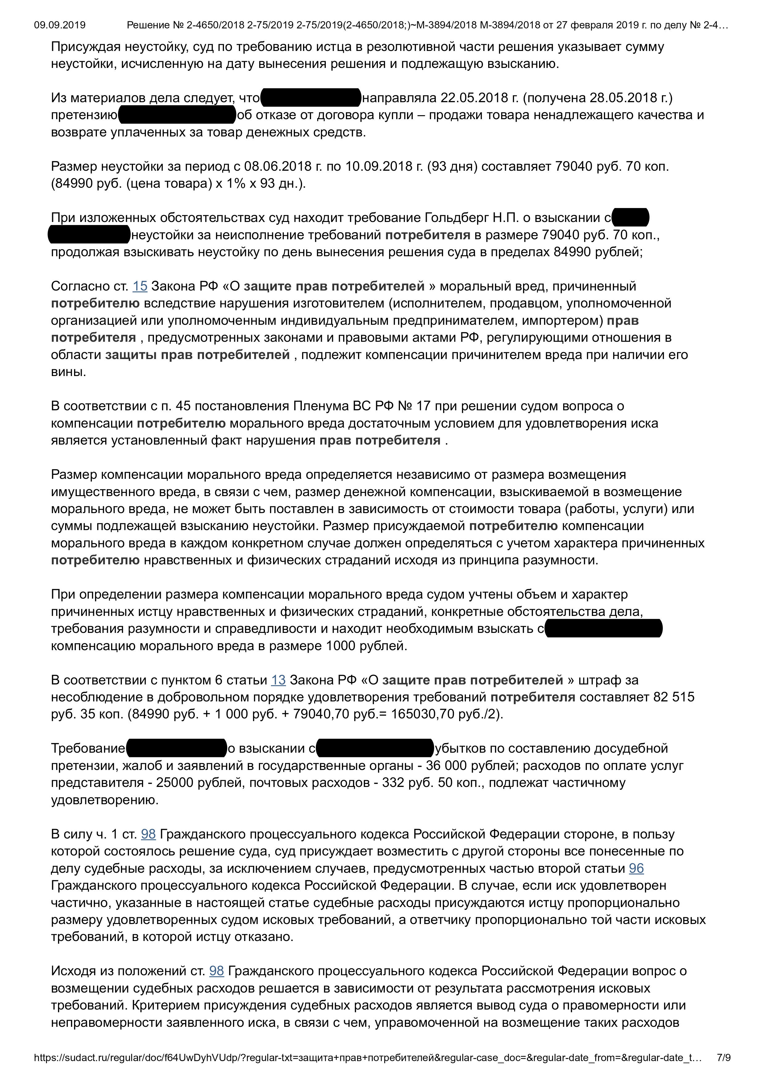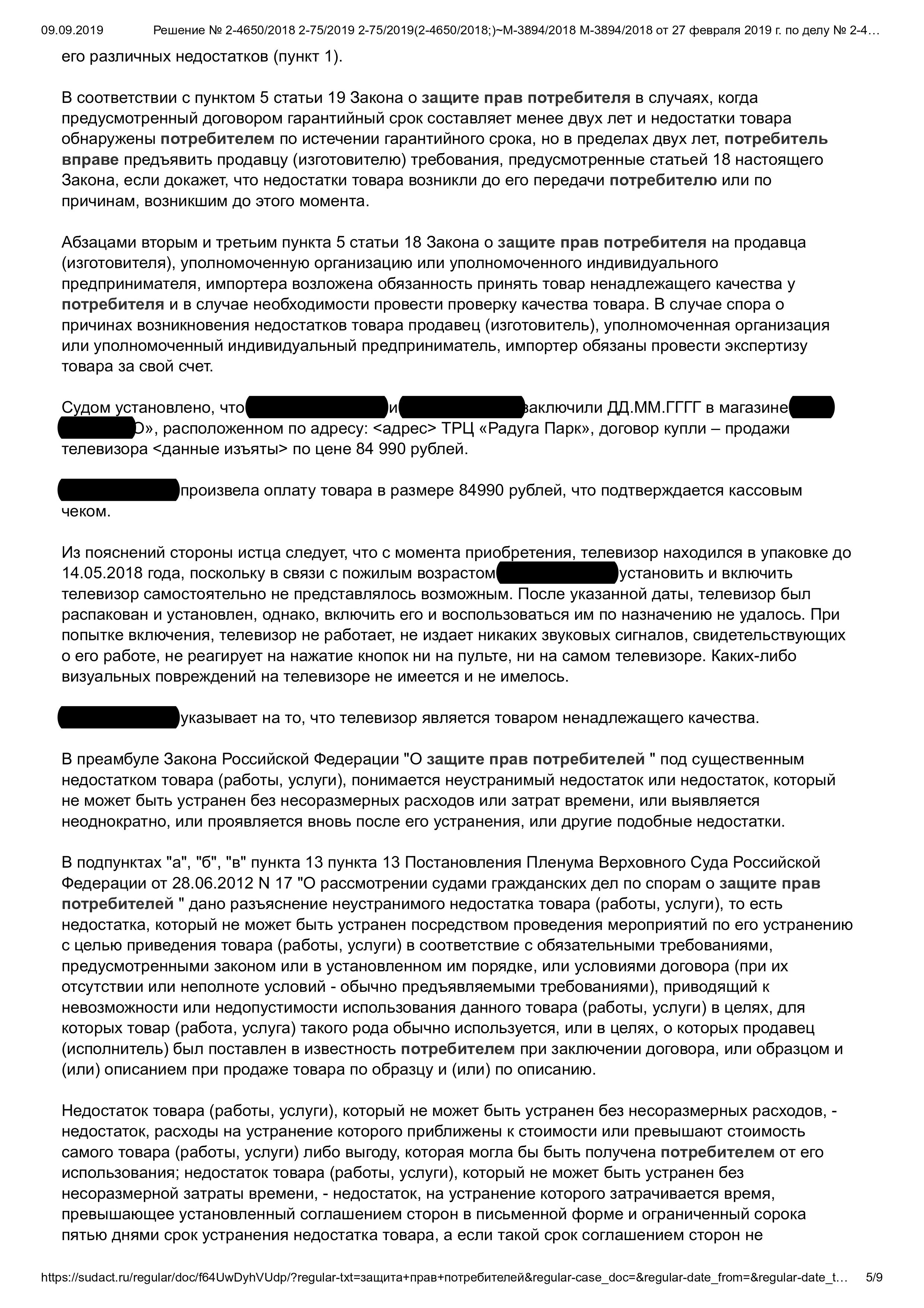 Юристы нашей организации в целях разрешения конфликта направили претензию к продавцу, однако компания, в свою очередь, изложенные требования не удовлетворила. Чтобы защитить интересы клиента, наши специалисты обратились в суд с исковым заявлением о взыскании с недобросовестного продавца: стоимости товара, компенсации морального вреда, а также понесенных судебных расходов. В итоге, в пользу нашей клиентки была взыскана стоимость телевизора, компенсация морального вреда, неустойка, расходы по составлению досудебной претензии, жалоб и заявлений, оплате услуг представителя, почтовые расходы, а также сумма штрафа.
