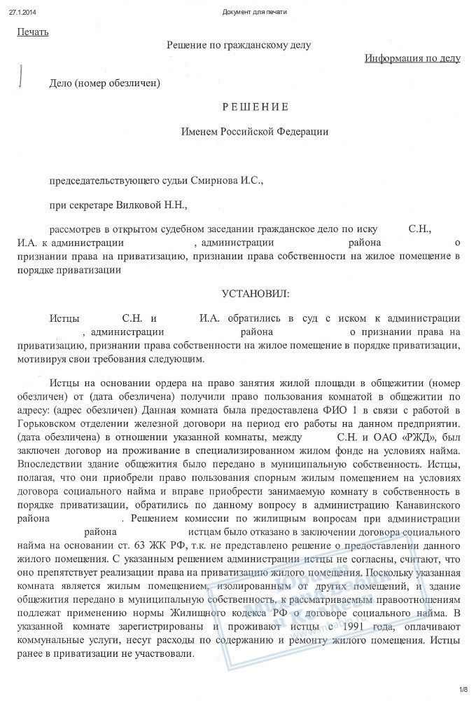 Гражданка К. и ее сын обратились в нашу компанию за помощью в оформлении прав на комнату в общежитии, предоставленную ранее её покойному мужу по месту работы в ОАО «РЖД».