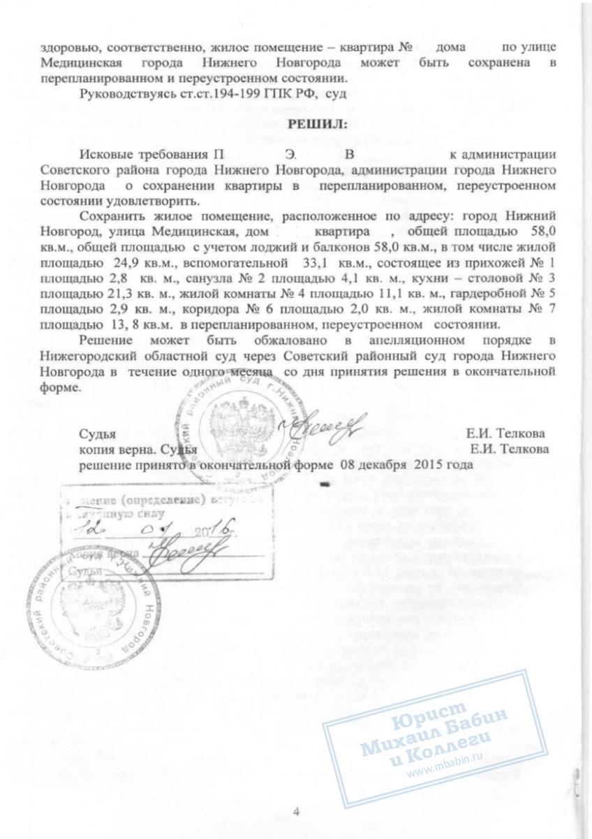 Юрист компании помог Э.П. сохранить квартиру в переустроенном состоянии и узаконить осуществлённую перепланировку через суд.